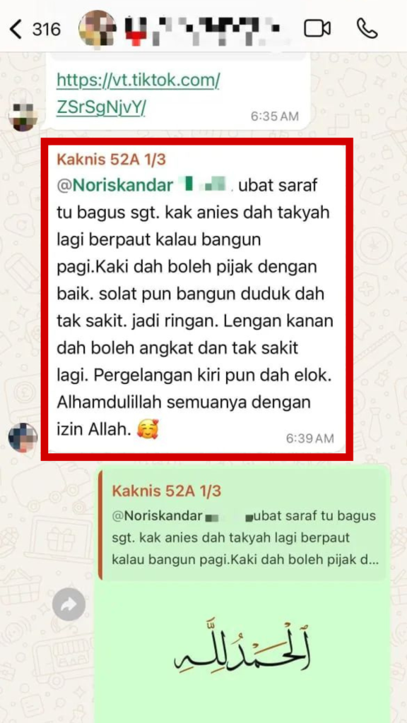 "Dah 6 Bulan Tanggung DERITA MASALAH SARAF. Alhamdulillah lepas 3 jam, SAKIT HILANG!"